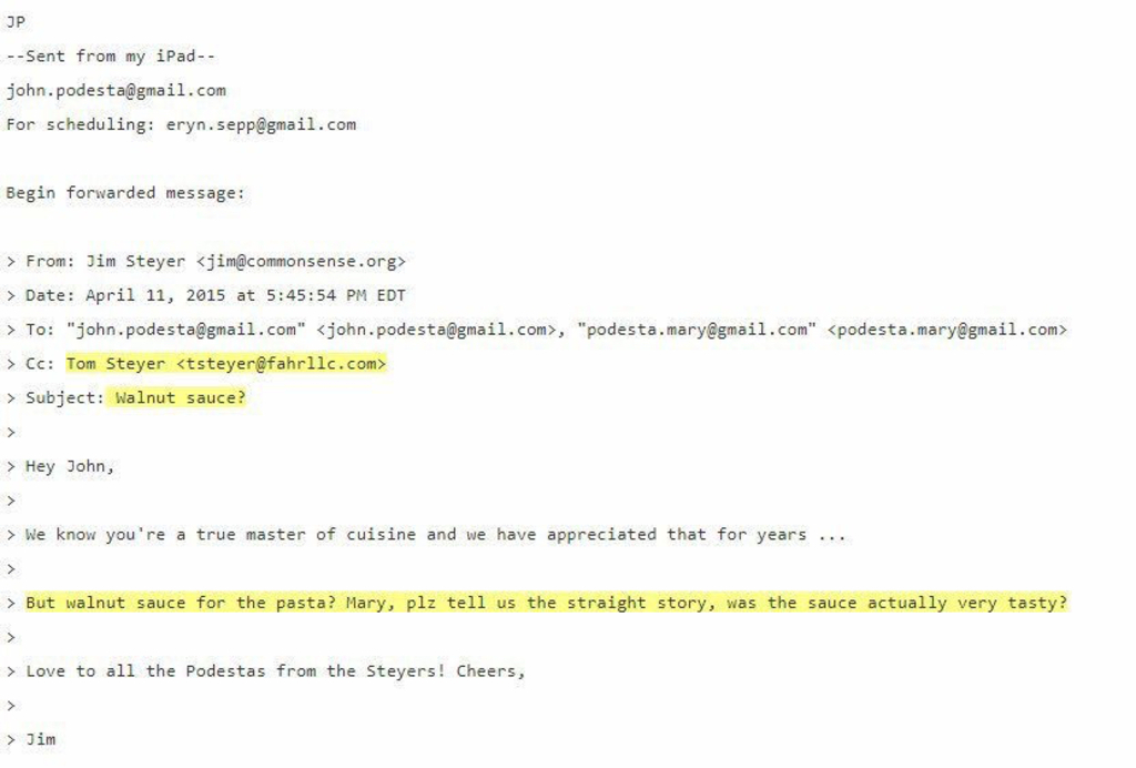 Jim Steyer asking John & Mary Podesta about WALNUT SAUCE (A pedo code describing the child as a black child). Maybe he is describing food but you see these PEDO WORDS through many of the emails. I know John Podesta is a cook so it could be food or could be pedo talk.