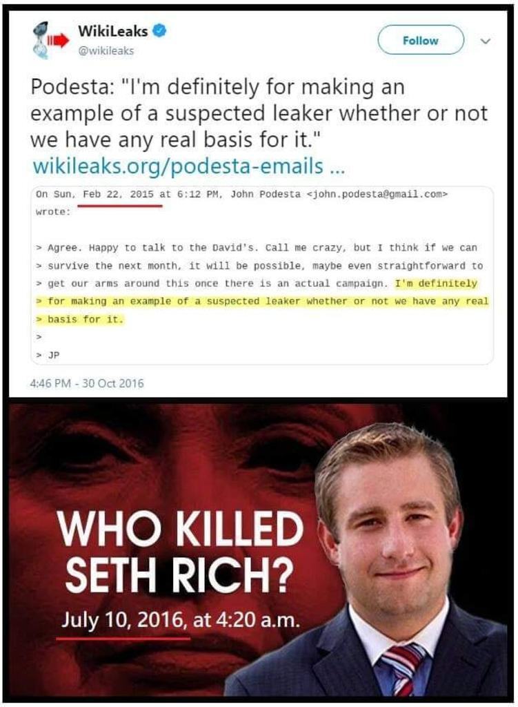 Wikileaks twitter account shows the John Podesta email where he says "I am DEFINITELY for making an EXAMPLE of a suspected leaker (Seth Rich) whether or not we have any real basis for it".