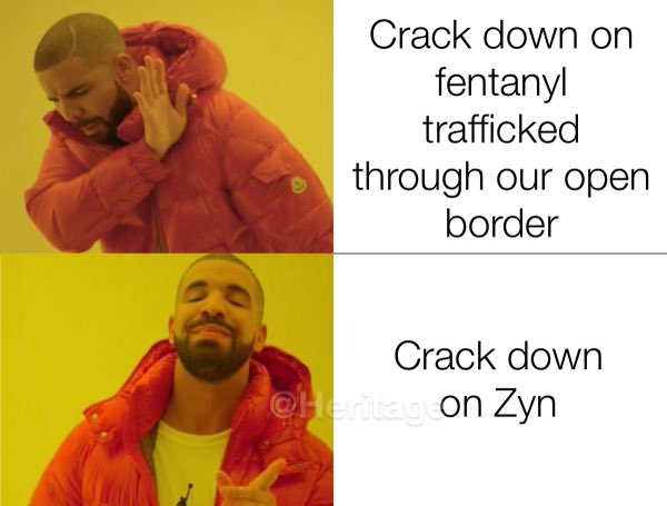 The boys like their 'Zyn'. It's a way to chill. By the way, why is it always nicotine we are regulating? Why not alcohol? It's also harmful to the body, mood altering and has way more problems than a cigarette or 'Zyn' ever had. Has anyone ever killed an innocent family driving the wrong way on a highway because they smoked too many cigarettes? Has anyone ever started a bar fight because they used a 'Zyn' pack? I would submit they have not. Are the Democrats just worked up over 'Zyn' because Tucker Carlson likes it?
