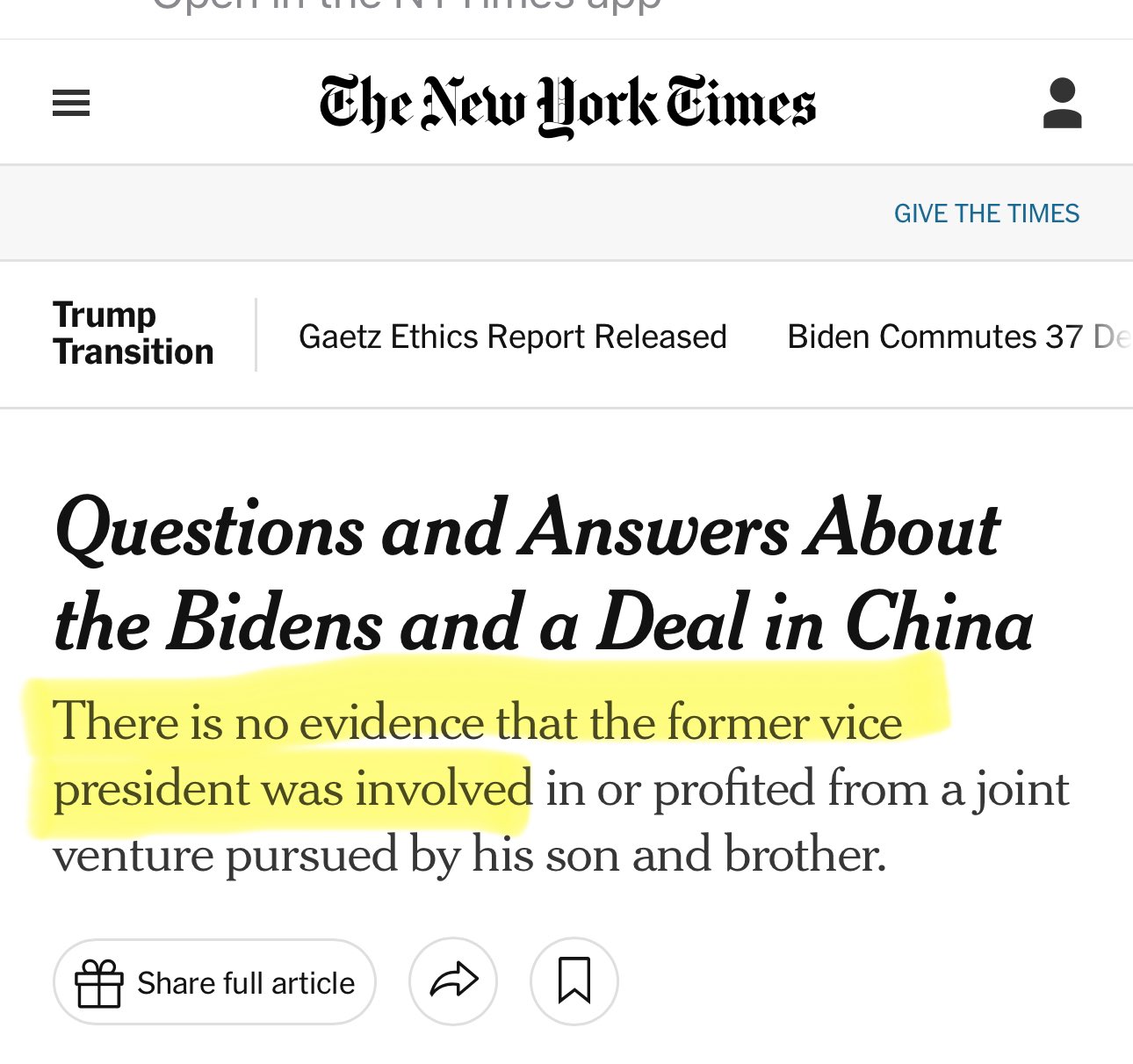 Might be a good time to update this one, NYT. https://pbs.twimg.com/media/Gf1YX_aWIAAoj-l?format=jpg&name=large -- This is from the Times' story in 2020 under the subhead "there is no evidence that the former vice president was involved in or profited from a joint venture pursued by his son and brother." These kinds of defenses of the Bidens were conveniently published shortly before the 2020 election and it was a coordinated media effort at the behest of the Democrats: “In the closing days of the campaign, President Trump and his allies are engaged in a last-ditch effort to raise questions about the ethics of former Vice President Joseph R. Biden Jr. by trying to link Mr. Biden to the international business dealings of Mr. Biden’s son, Hunter, and one of his brothers, James. Their efforts have drawn on a number of sources, including emails, photographs of encrypted text messages and other documents provided by Tony Bobulinski, a former business associate of Hunter and James Biden.”