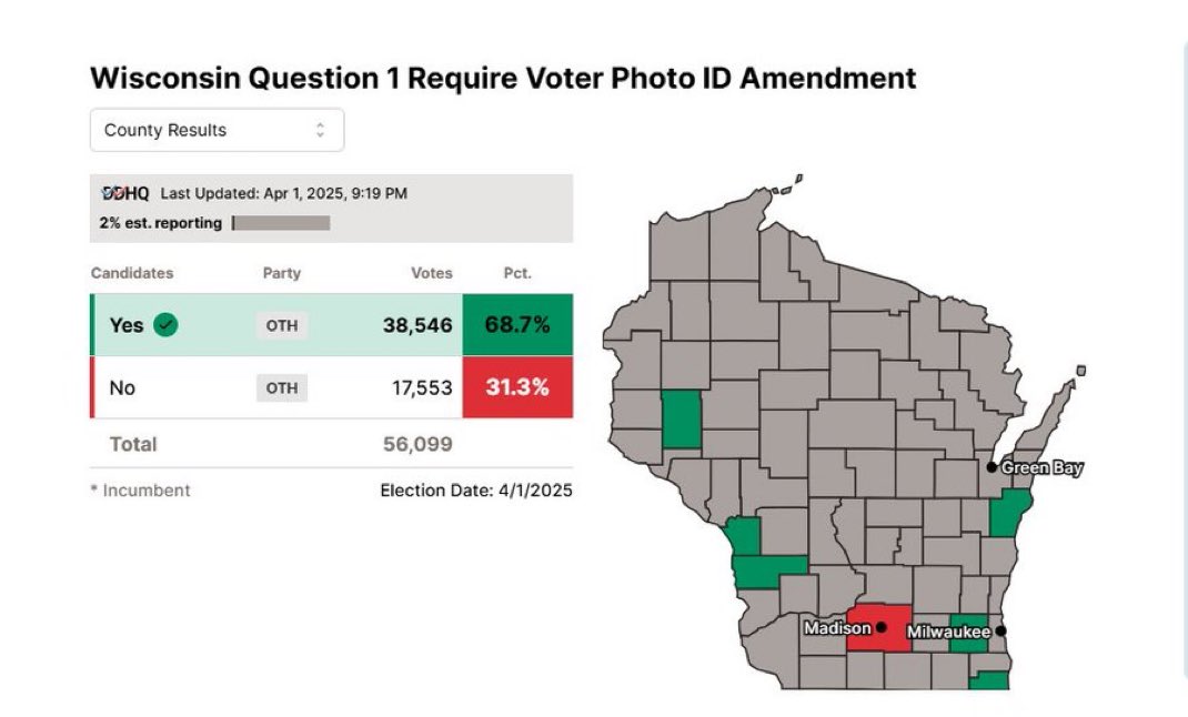 Posted • April 2, 2025: You’re not going to win them all. Often in elections, you’re going to lose. Republicans won the special elections in Florida to fill the vacancies left by Reps. Matt Gaetz and Michael Waltz. In Wisconsin, liberals maintained their 4-3 majority in the state Supreme Court. A ballot initiative to add Voter ID to the Wisconsin state constitution is currently passing overwhelmingly: https://pbs.twimg.com/media/GnfidN7WsAAoPHt?format=jpg&name=medium —— The moral of the story here tonight. Every Republican Secretary of State candidate in the country needs to be hammering on Voter ID for the midterms. This is a winning issue. Even Democrats want this. The ballot initiative on voter ID passed overwhelmingly. I’m not for moral victories here: losing that supreme court race sucks. Yet, CNN’s Scott Jennings had the best take on tonight: neither side should over-analyze the results here.