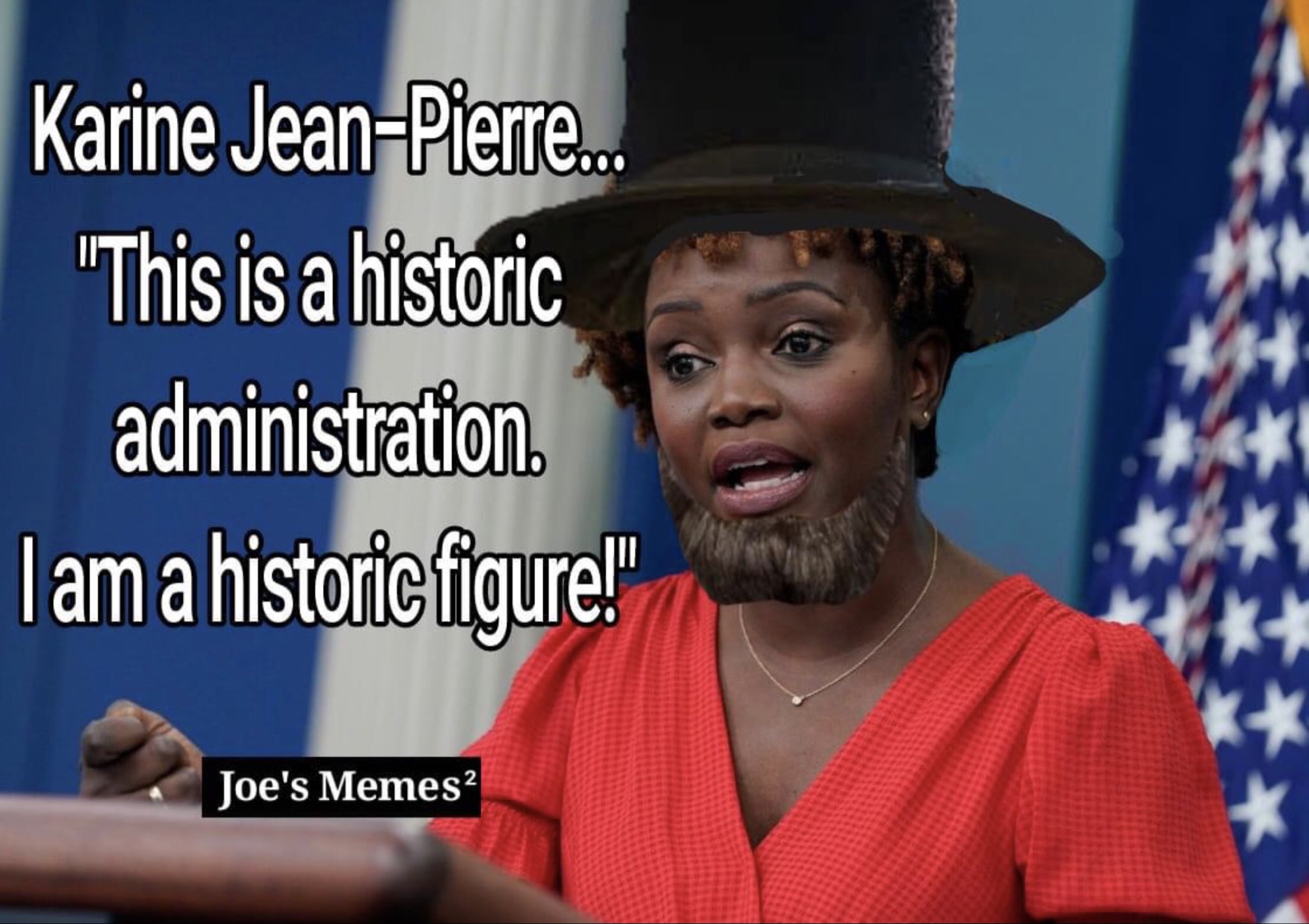 We're not the only ones tired of this constant parade of identity victimhood by Jean-Pierre. Upon hearing this clip, Megyn Kelly -- who is always ready to drop a nuke on those who deserve it -- FLATTENED KJP with a single question: —— Megyn Kelly @megynkelly: “Has she done even one interview where she didn’t mention she is black?” —— Nope. Not once. Nor has she ever done one where she doesn't shout her 'LGBTQ+' status from the rooftops. Because that's all she's got. Has she done one where she didn’t lie? Excellent follow-up question. The answer is also no. For Democrats, that’s the highest level of achievement. Skin color. Hey, now. Let's not discount the fact that KJP is a 'historic' figure. Just ask her. https://pbs.twimg.com/media/G3yu5tyXUAAs2-6?format=jpg&name=large —— OOF. Poor Abe never looked so bad. (…)